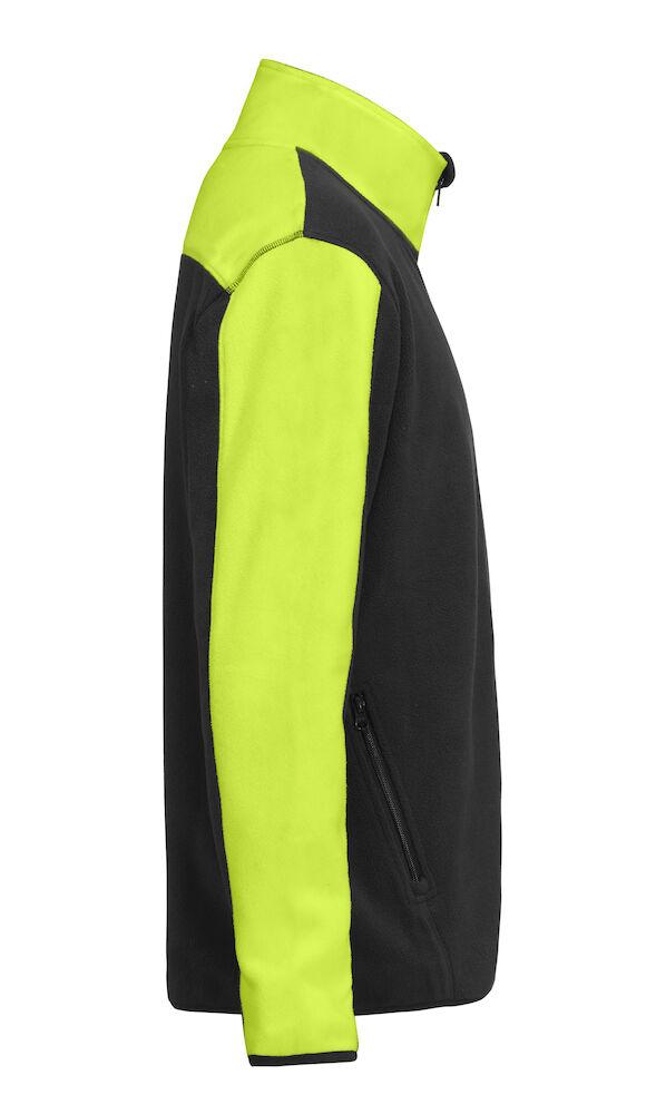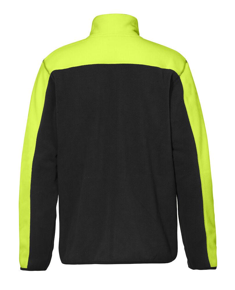 Mot den svarta basen sitter den floursenserande gula för att skapa en förhöjd synbarhet i lågt upplysta miljöer eller inomhus. Två framfickor som är dragkedje försedda, elastika muddar i ärmavslut och i nederkant för att hålla kalldrag borta och skapa en mer värmande funktion i denna fleecejacka.